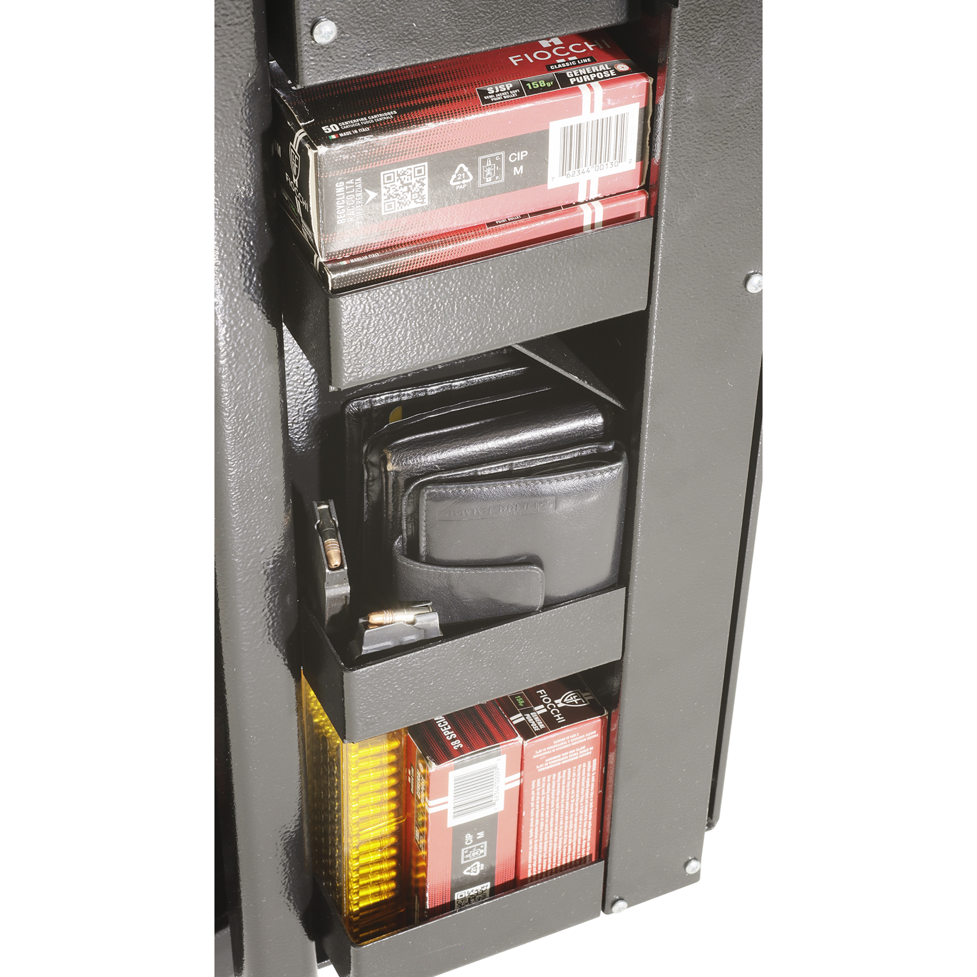 - Slip / stop geværstativ – kan reguleres trinnløst etter behov. Ved å trekke geværstativet 30mm fremover i skapet kan det settes to gevær på tvers bakerst i skapet, uten at det påvirker det som står i geværstativet. Stativet kan reguleres i den høyden du ønsker.