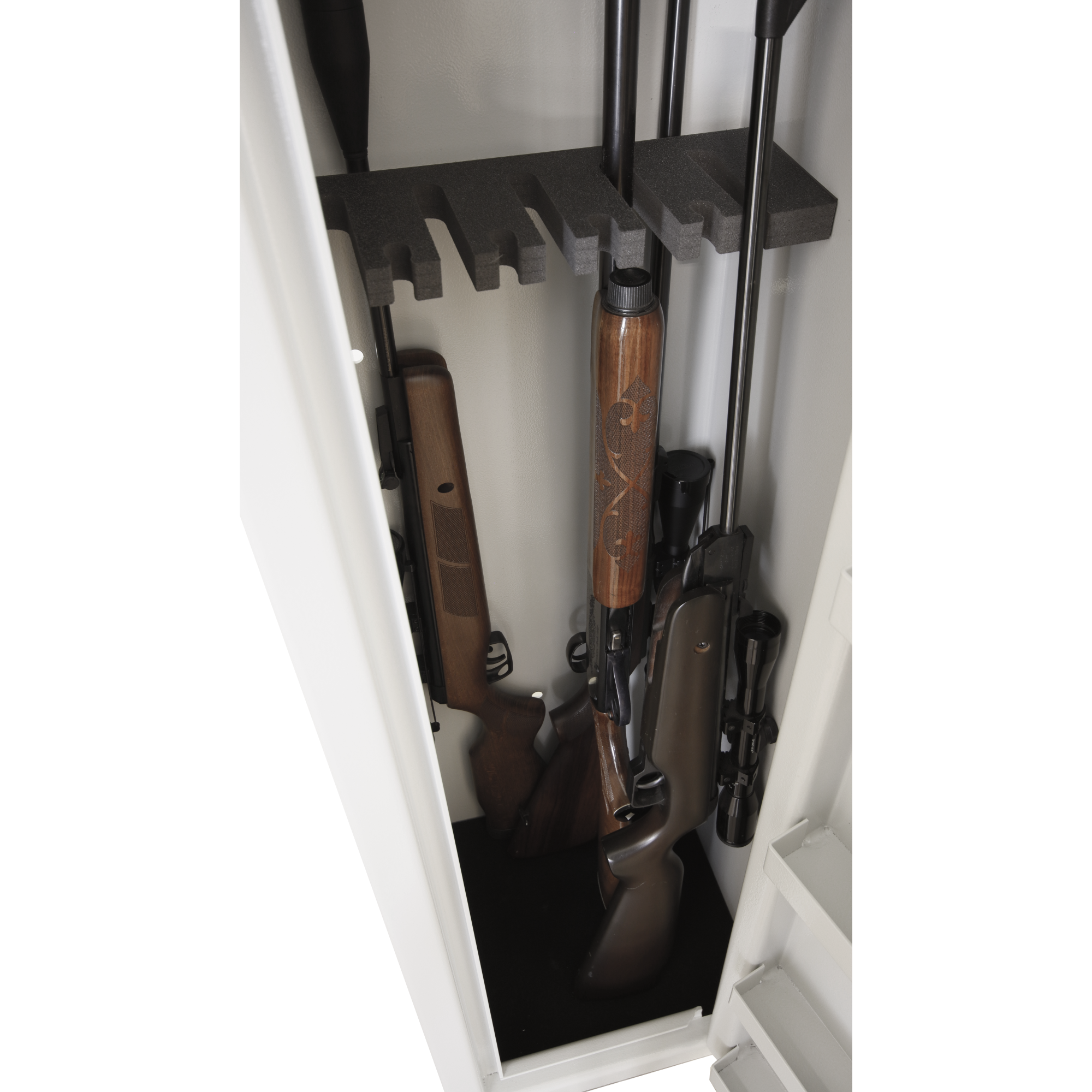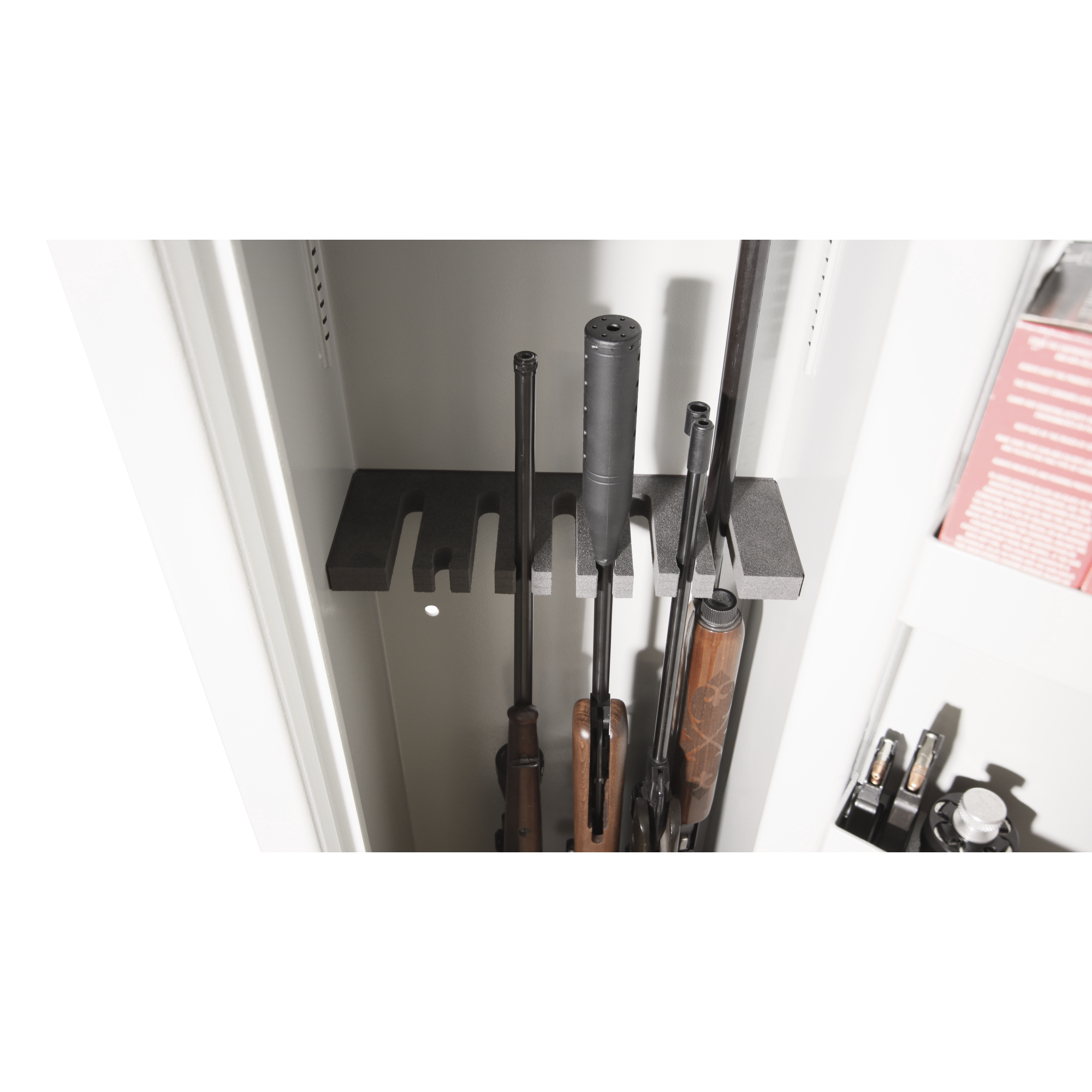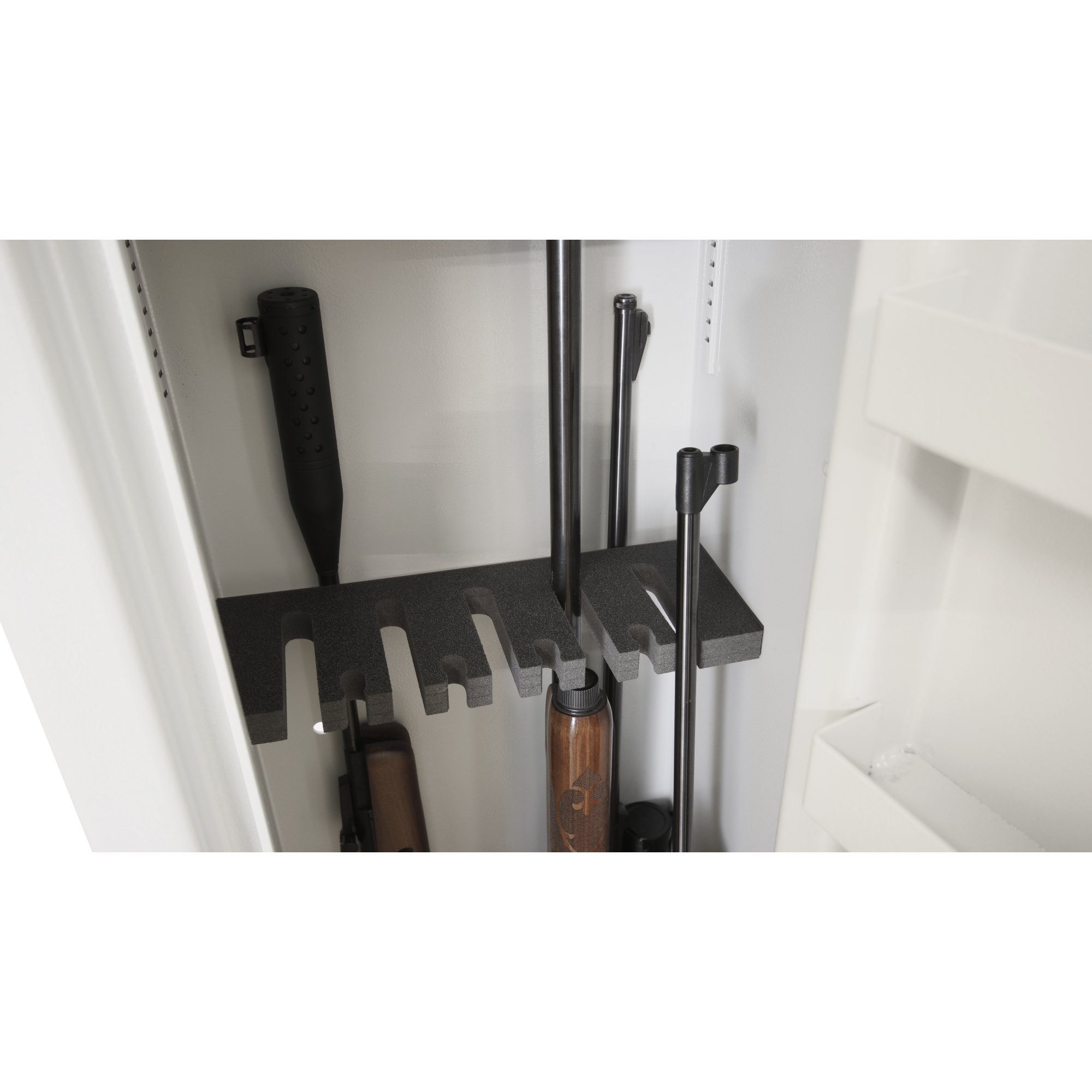 • Slip / stop geværstativ – kan reguleres trinnløst etter behov. Ved å trekke geværstativet 30mm fremover i skapet kan det settes to gevær på tvers bakerst i skapet, uten at det påvirker det som står i geværstativet. Stativet kan reguleres i den høyden du ønsker.